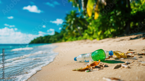 Obraz premium Plastic bottles and trash washed up on a pristine beach, symbolizing the...