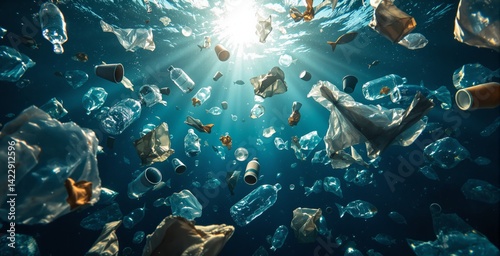 Fototapeta premium Plastic bottles, bags, and cups drifting underwater with sunlight rays and...