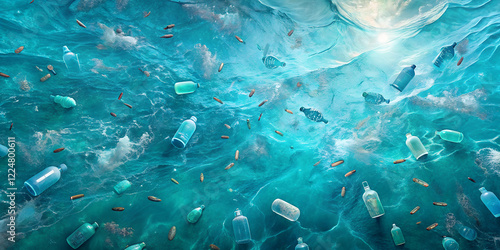 Fototapeta premium Plastic bottles, disturbing mood, scattered in polluted ocean water,...