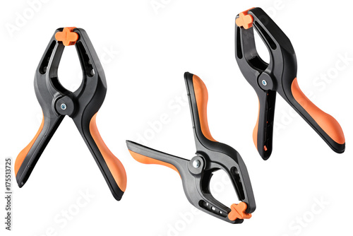 © Serghei V, Obraz premium Plastic clamp for fastening wooden and metal objects isolated on white