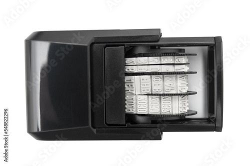 © unclepodger, Fototapeta premium Plastic date stamper close up on white background