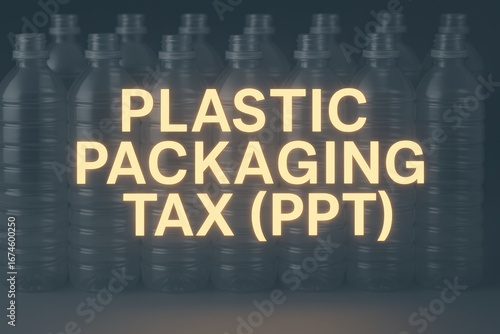 © Cre-AI-Tor , Obraz premium Plastic Packaging Tax Message Over Transparent Bottles