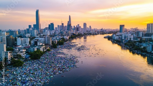 © Tin, Naklejka premium Plastic pollution concept. Aerial view of a bustling city skyline at sunset beside a river filled with waste.