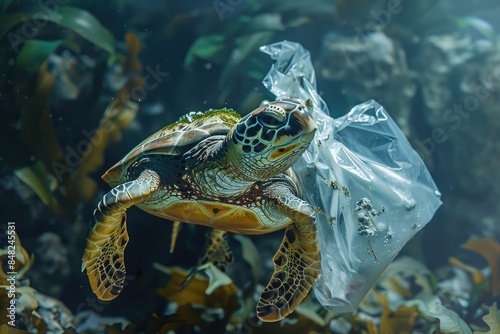 Obraz premium Plastic Pollution In Ocean Turtle Eat Plastic Bag Environmental Problem