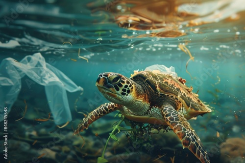 Obraz premium Plastic Pollution In Ocean Turtle Eat Plastic Bag Environmental Problem
