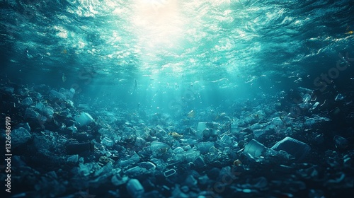 Obraz premium Plastic pollution in the ocean – garbage floating on the sea with underwater shine