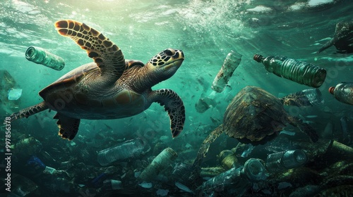 Fototapeta premium Plastic pollution with turtles swimming underwater between discarded plastic bottles.