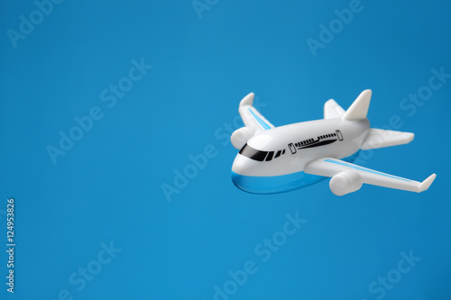 © lunglee, Obraz premium plastic toy plane flying on blue background