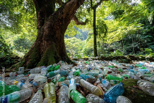 Obraz premium Plastic waste litters forest floor beneath large tree