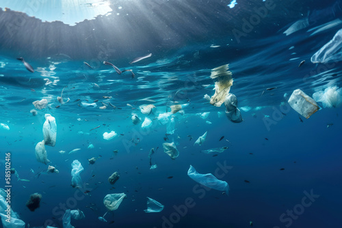 Fototapeta premium Plastic waste underwater in the ocean - Generative AI