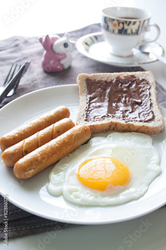 Fototapeta premium Plate of breakfast with egg, sausages, bread and chocolate cream