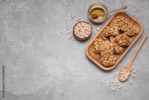 © New Africa, Fototapeta premium Plate with puffed rice pieces (kozinaki) on grey table, flat lay. Space for text