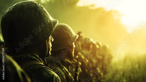 © Jojo*, Naklejka premium Platoon of soldiers in silhouette standing in formation during a golden sunrise.