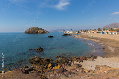 © acceleratorhams, Obraz premium Playa de Nares beach Puerto de Mazarron Murcia south east Spain one of many beautiful beaches in this Spanish coast town by the Mediterranean Sea