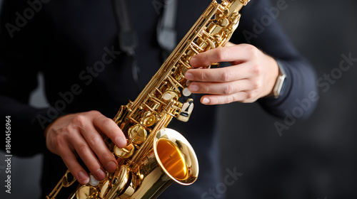 Fototapeta premium Player masterfully manipulates keys of gleaming golden saxophone, creating beautiful music. Skilled hands demonstrate precision on intricate instrument.