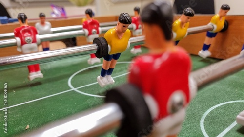 © Richard, Fototapeta premium Players in a small table foosball game playing in Red and Yellow.