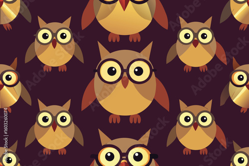 © Shakir, Fototapeta premium Playful and charming owl pattern with trendy glasses in warm brown and golden tones for various design applications and creative projects