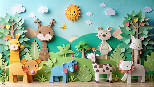 Naklejka premium Playful and cute paper craft animals in whimsical scenes