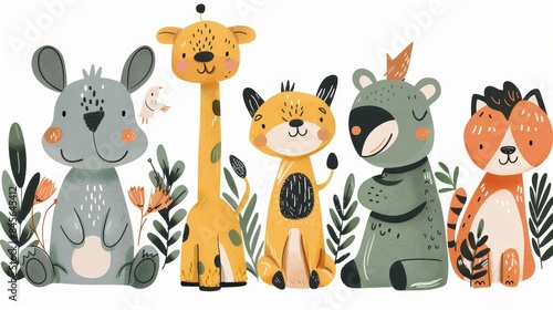 Naklejka premium Playful and cute whimsical animals, hand-drawn by flat colors, six distinct animals, isolated on white, no collisions, full frame