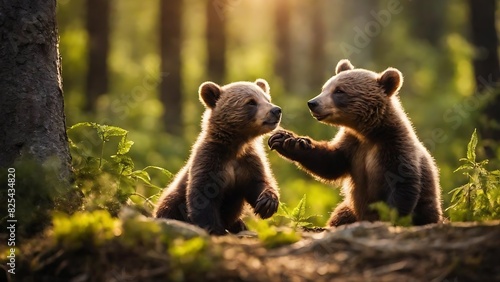 © Tauqeer, Fototapeta premium Playful Bear Cubs Interacting in Forest at Sunset