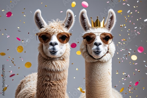 © Michael, Fototapeta premium Playful Beige Llama and Alpaca in Sunglasses and Crown Surrounded by Confetti for a Joyful Birthday Celebration Design