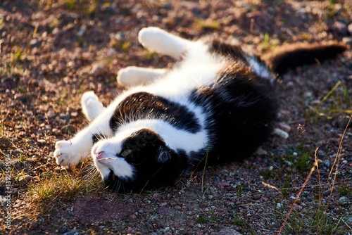 © Wirestock, Fototapeta premium Playful black and white cat on gravel
