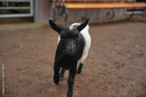 © callisto, Fototapeta premium Playful black and white goat walking towards the camera in a farm setting