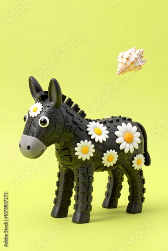 © amorn_m, Fototapeta premium Playful Black Toy Donkey Adorned with Daisies Against a Vibrant Yellow Background