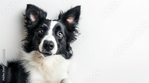 © enigmaestro, Fototapeta premium Playful border collie dog laying on white floor with ears up, Australian shepherd dog looking at camera, shot from above, room for type, pets, pet care, animal companionship, and veterinary concepts,