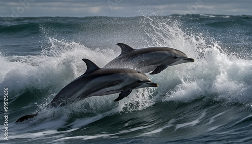 © Stockgiu, Fototapeta premium Playful bottle nosed dolphin jumping in blue water generated by AI