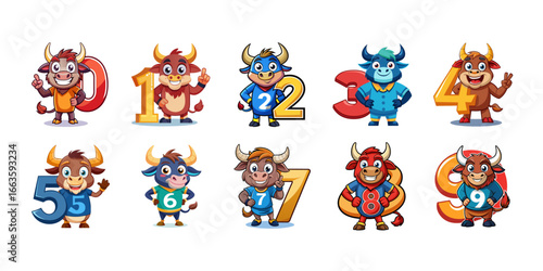 Obraz premium Playful Bull Numbers Vector Set 0-9 | Cute Animal Character Illustrations for...