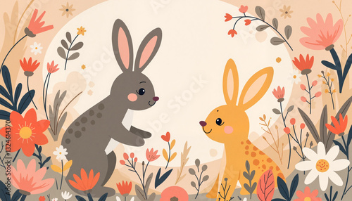 © Svetlana, Obraz premium Playful bunnies interacting in floral forest, whimsical adventure