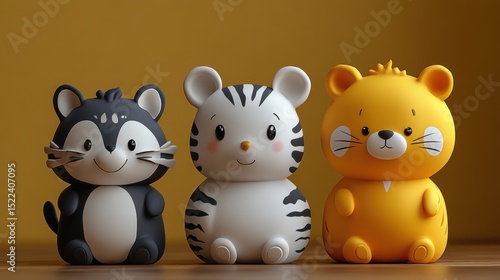 © nucharat, Naklejka premium Playful Cartoon Animal Figures in Yellow Background Cute Characters Adorable Toys Digital Render Childrens Design