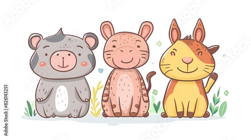 Naklejka premium Playful Cartoon Animals in Minimalistic Style on White Background