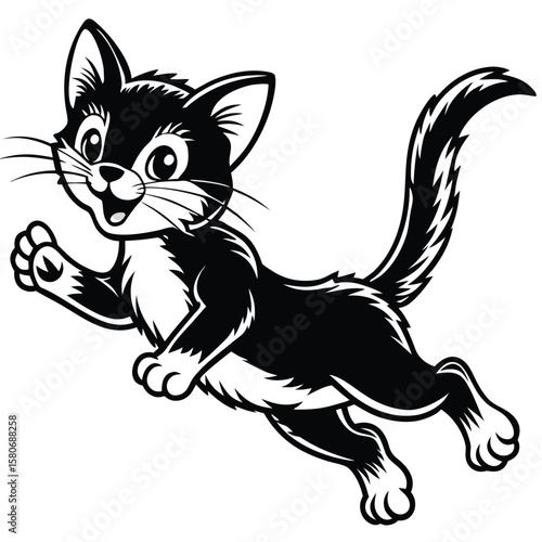 Obraz premium Playful cartoon black and white cat jumping with happy expression silhouette