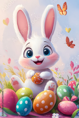 © Atchariya63, Obraz premium playful cartoon bunny holding Easter egg surrounded by colorful eggs, flowers, and butterflies