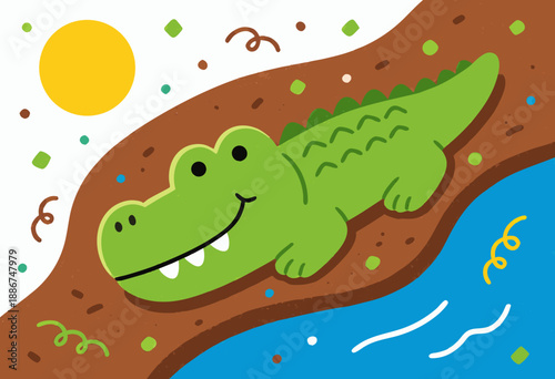 Obraz premium playful cartoon crocodile basking by river with colorful patterns and bright sunshine