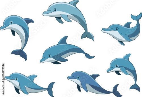 © Sohan Creatives, Naklejka premium Playful cartoon dolphins in various swimming and jumping poses – cad drawing flat vector illustration vectorizer