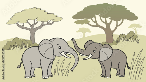 Naklejka premium Playful Cartoon Elephants in African Safari Landscape