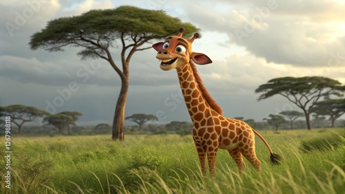 © Normal Desing, Naklejka premium Playful cartoon giraffe in serengeti grasslands animation nature scene sunny sky whimsical character
