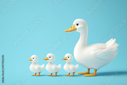 © Mariani, Fototapeta premium Playful cartoon scene featuring a mother duck and three ducklings on a vibrant blue background
