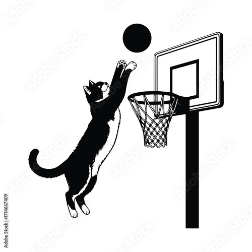 © Hasan, Fototapeta premium Playful cat in silhouette jumping to shoot a basketball into a hoop silhouette