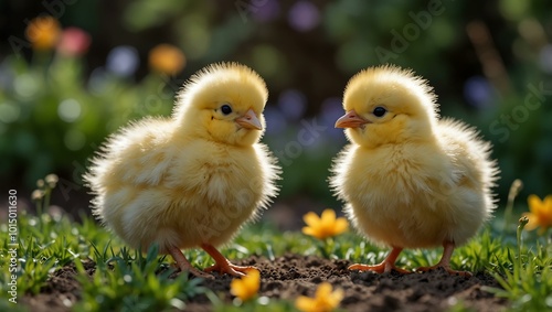 © claudunia, Fototapeta premium Playful chicks exploring a vibrant garden filled with life.