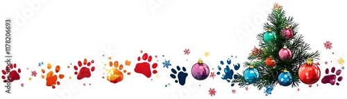 Fototapeta premium Playful Christmas tree crafted from dog paw prints, adorned with colorful ornaments, bringing a whimsical and festive touch to greeting cards, banners, and designs