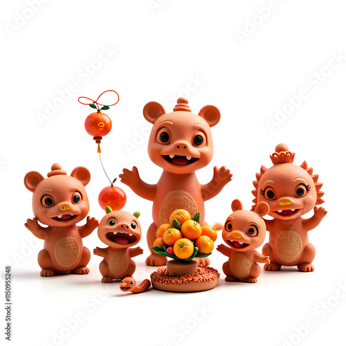 © Wuttichai, Naklejka premium Playful clay animals celebrate with a bountiful orange offering, 3d render of whimsical characters concept.