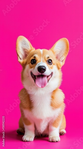 © Agnieszka, Obraz premium Playful corgi puppy on a table against a vibrant pink backdrop