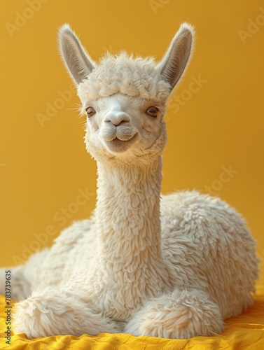 © Thanadol, Fototapeta premium Playful 3D alpaca, cartoon design, lying down on a soft pastel yellow background, vibrant accents