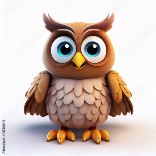 © ArtPixel-Portfolio, Fototapeta premium Playful 3D cartoon owl spreading wings, smiling brightly against pristine white backdrop, radiating cheerful animated charm