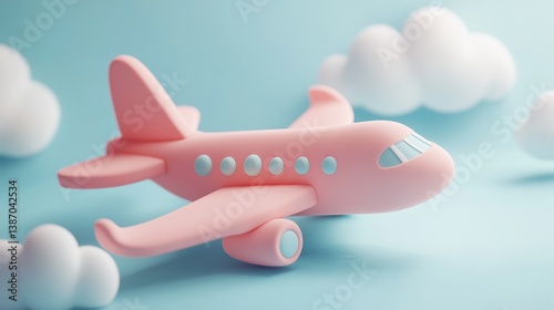 Fototapeta premium Playful 3D clay style airplane with cartoon passengers flying through stylized clouds representing family travel adventure with cheerful characters enjoying flight across blue sky vacation concept