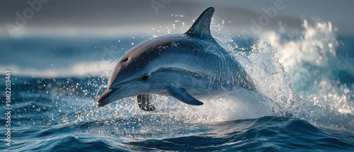 Fototapeta premium Playful dolphin leaping above ocean waves under clear blue sky